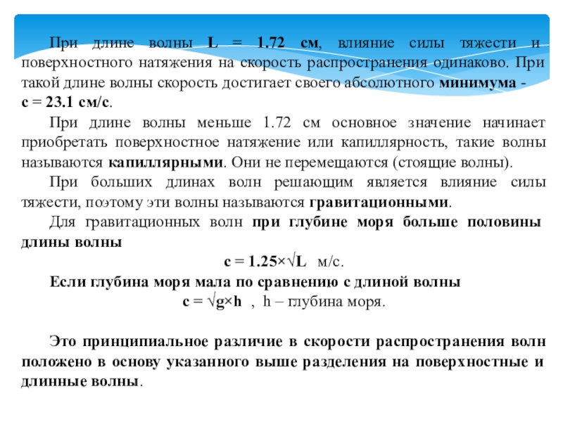 При длине волны меньше 1.72 см основное значение начинает приобретать поверхностное натяжение или капиллярность, такие волны называются капиллярными. Они не перемещаются (стоящие волны).