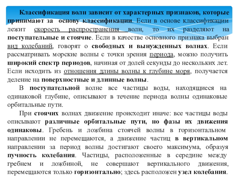 их разделяют на поступательные и стоячие. Если в качестве основного признака выбран вид колебаний, говорят о свободных и вынужденных волнах. Если рассматривать морские волны с точки зрения периода, можно получить широкий спектр периодов, начиная от долей секунды до нескольких лет. Если исходить из отношения длины волны к глубине моря, получается деление на поверхностные и длинные волны.