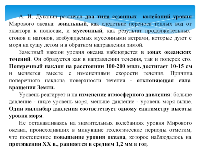 Слайд 8 А. И. Дуванин различал два типа сезонных колебаний уровня Мирового