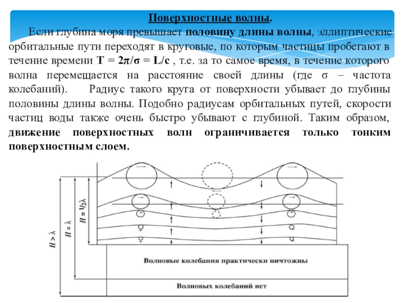 времени Т = 2π/σ = L/c , т.е. за то самое время, в течение которого волна перемещается на расстояние своей длины (где σ – частота колебаний). Радиус такого круга от поверхности убывает до глубины половины длины волны. Подобно радиусам орбитальных путей, скорости частиц воды также очень быстро убывают с глубиной. Таким образом, движение поверхностных волн ограничивается только тонким поверхностным слоем.
