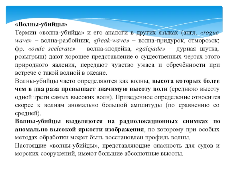 scelerate» – волна-злодейка, «galejade» – дурная шутка, розыгрыш) дают хорошее представление о существенных чертах этого природного явления, передают чувство ужаса и обречённости при встрече с такой волной в океане.