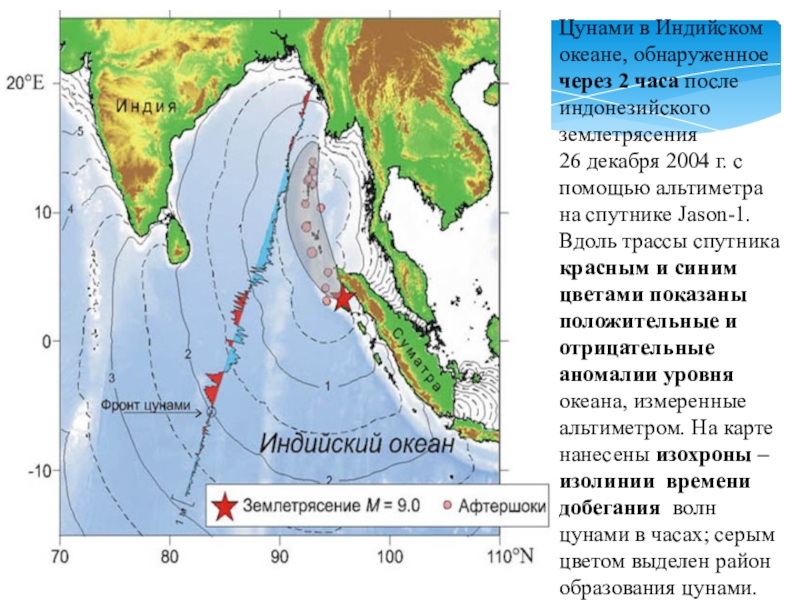 Jason-1. Вдоль трассы спутника красным и синим цветами показаны положительные и отрицательные аномалии уровня океана, измеренные альтиметром. На карте нанесены изохроны – изолинии времени добегания волн цунами в часах; серым цветом выделен район образования цунами.