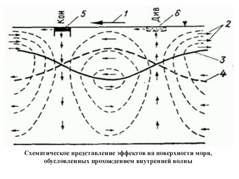Слайд 42Схематическое представление эффектов на поверхности моря, обусловленных прохождением внутренней волны