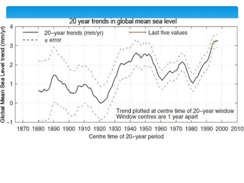 Не останавливаясь на значительных колебаниях уровня Мирового океана, происходивших в минувшие геологические периоды отметим, что постепенное повышение уровня океана, которое наблюдалось на протяжении XX в., равняется в среднем 1,2 мм в год.