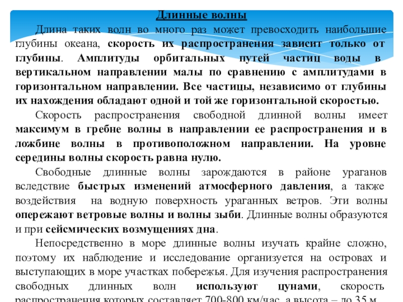 Слайд 36 Все длинные волны связаны с горизонтальным перемещением частиц воды, которое