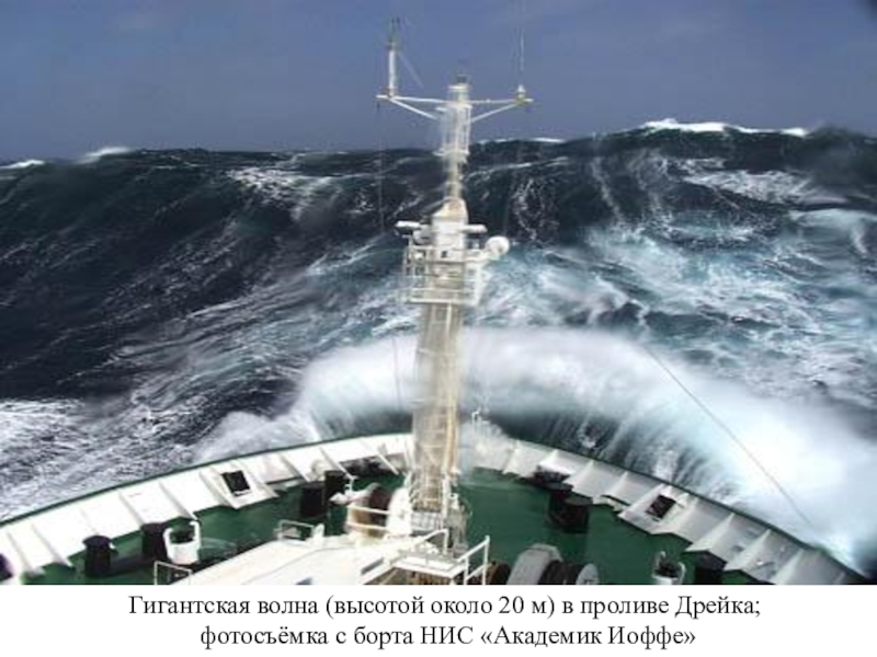 Слайд 27Гигантская волна (высотой около 20 м) в проливе Дрейка;