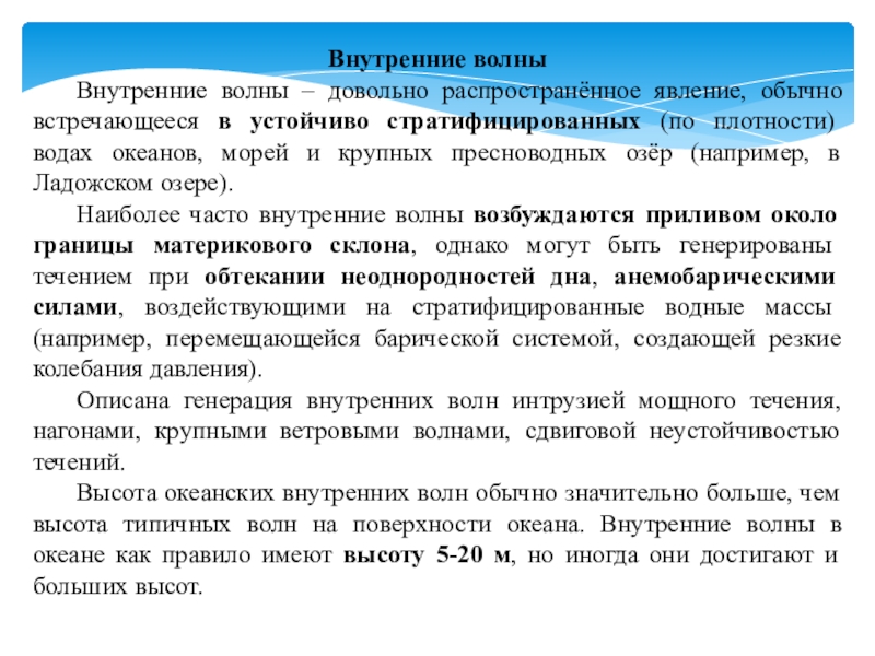 Описана генерация внутренних волн интрузией мощного течения, нагонами, крупными ветровыми волнами, сдвиговой неустойчивостью течений.