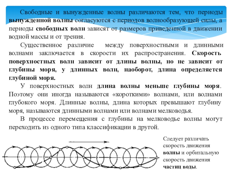 Существенное различие между поверхностными и длинными волнами заключается в скорости их распространения. Скорость поверхностных волн зависит от длины волны, но не зависит от глубины моря, у длинных волн, наоборот, длина определяется глубиной моря.