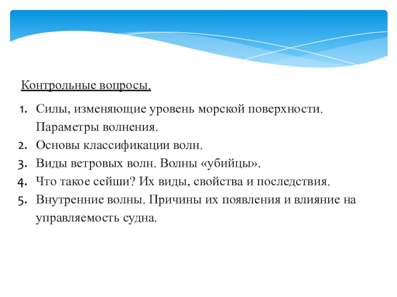 Силы, изменяющие уровень морской поверхности. Параметры волнения.