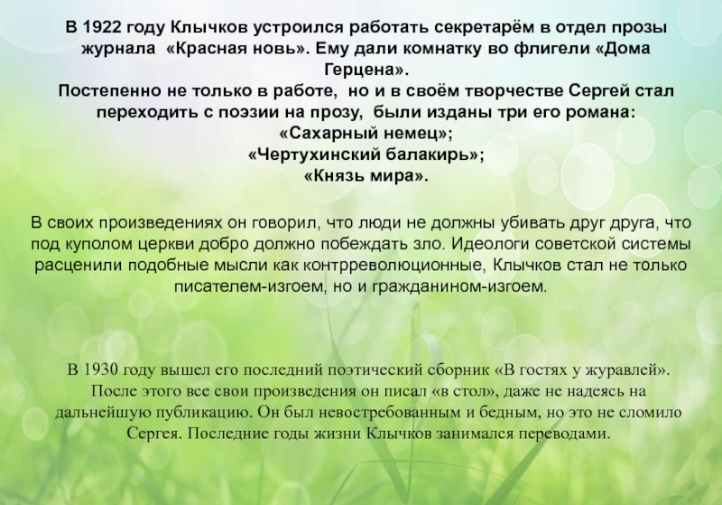 В 1930 году вышел его последний поэтический сборник «В гостях у журавлей». После этого все свои произведения он писал «в стол», даже не надеясь на дальнейшую публикацию. Он был невостребованным и бедным, но это не сломило Сергея. Последние годы жизни Клычков занимался переводами.