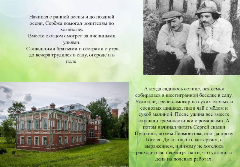 А когда садилось солнце, вся семья собиралась в шестигранной беседке в саду. Ужинали, грели самовар на сухих еловых и сосновых шишках, пили чай с мёдом и сухой малиной. После ужина все вместе слушали грампластинки с романсами. А потом начинал читать Сергей сказки Пушкина, поэмы Лермонтова, иногда прозу Гоголя. Делал он это, как артист, с выражением, и никому не хотелось расходиться, несмотря на то, что устали за день на полевых работах.