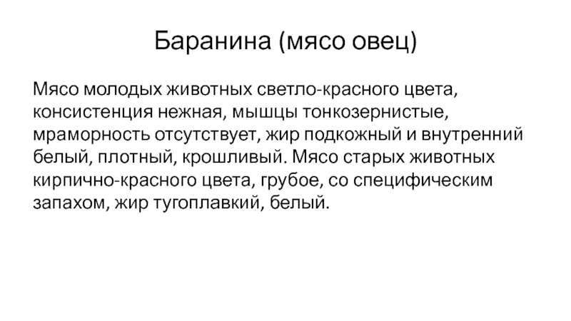 Мясо старых животных кирпично-красного цвета, грубое, со специфическим запахом, жир тугоплавкий, белый.
