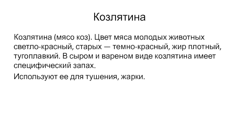 темно-красный, жир плотный, тугоплавкий. В сыром и вареном виде козлятина