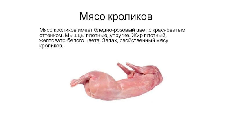 плотные, упругие. Жир плотный, желтовато-белого цвета. Запах, свойственный мясу кроликов.
