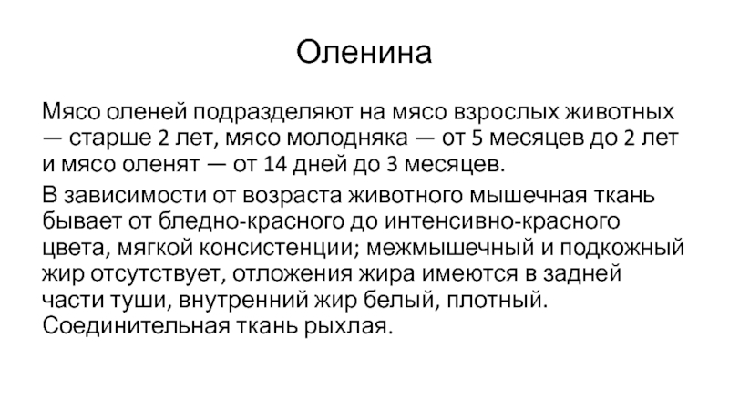 Мясо оленей подразделяют на мясо взрослых животных — старше 2