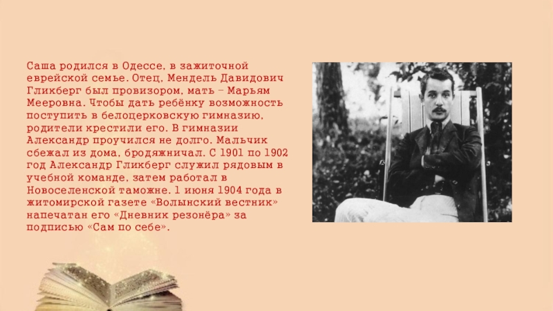 ребёнку возможность поступить в белоцерковскую гимназию, родители крестили его. В гимназии Александр проучился не долго. Мальчик сбежал из дома, бродяжничал. С 1901 по 1902 год Александр Гликберг cлужил рядовым в учебной команде, затем работал в Новоселенской таможне. 1 июня 1904 года в житомирской газете «Волынский вестник» напечатан его «Дневник резонёра» за подписью «Сам по себе».