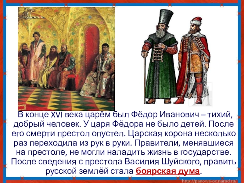 Слайд 2 В конце XVI века царём был Фёдор Иванович – тихий,