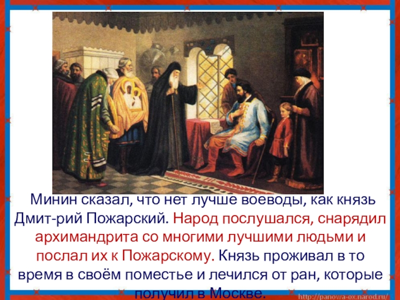 Слайд 12 Минин сказал, что нет лучше воеводы, как князь Дмит-рий Пожарский.