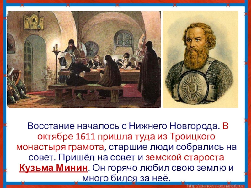 на совет и земской староста Кузьма Минин. Он горячо любил свою землю и много бился за неё.
