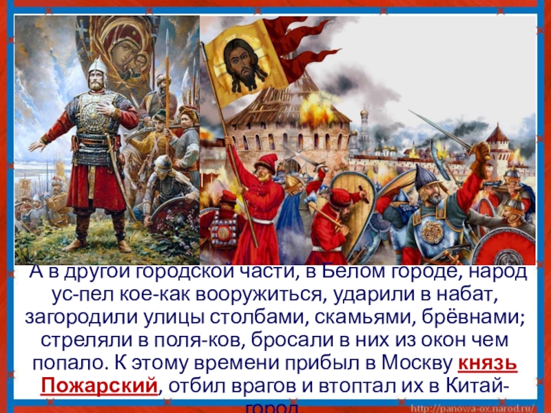 стреляли в поля-ков, бросали в них из окон чем попало. К этому времени прибыл в Москву князь Пожарский, отбил врагов и втоптал их в Китай-город.