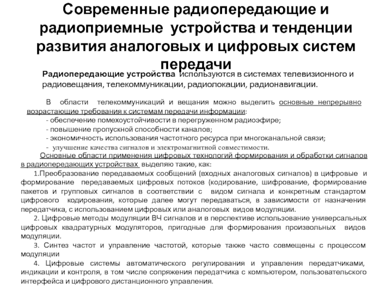Основные области применения цифровых технологий формирования и обработки сигналов в радиопередающих устройствах выделяю такие, как: