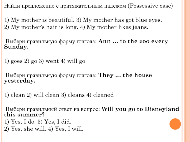 Найди предложение с притяжательным падежом (Possessive case)1) My mother is beautiful. 3) My mother has got blue