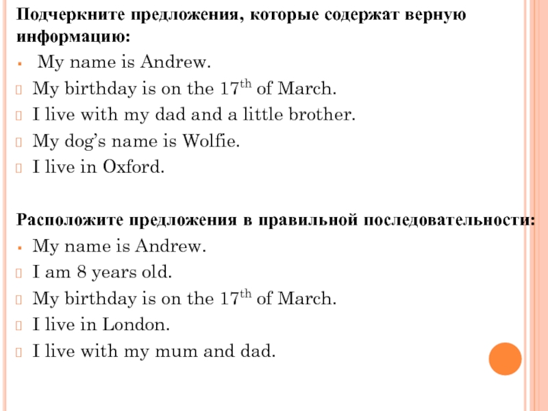 Подчеркните предложения, которые содержат верную информацию: My name is Andrew.My birthday is on the 17th of March.I live