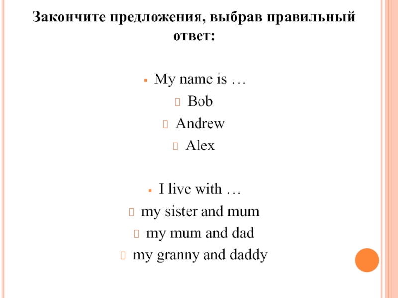 Закончите предложения, выбрав правильный ответ:My name is …BobAndrewAlexI live with …my sister and mummy mum and dadmy