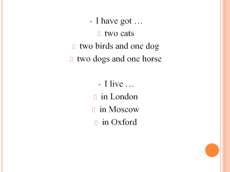 I have got …two catstwo birds and one dogtwo dogs and one horseI live …in Londonin Moscowin