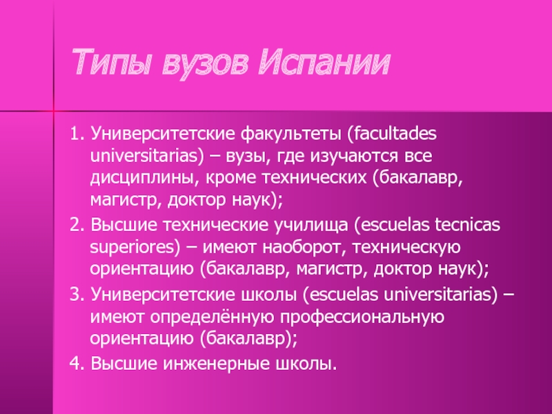 Широко известны в мире также университеты в Барселоне и Гранаде. Барселонский университет появился в 1450 году, а Гранадский - в 1526 году .