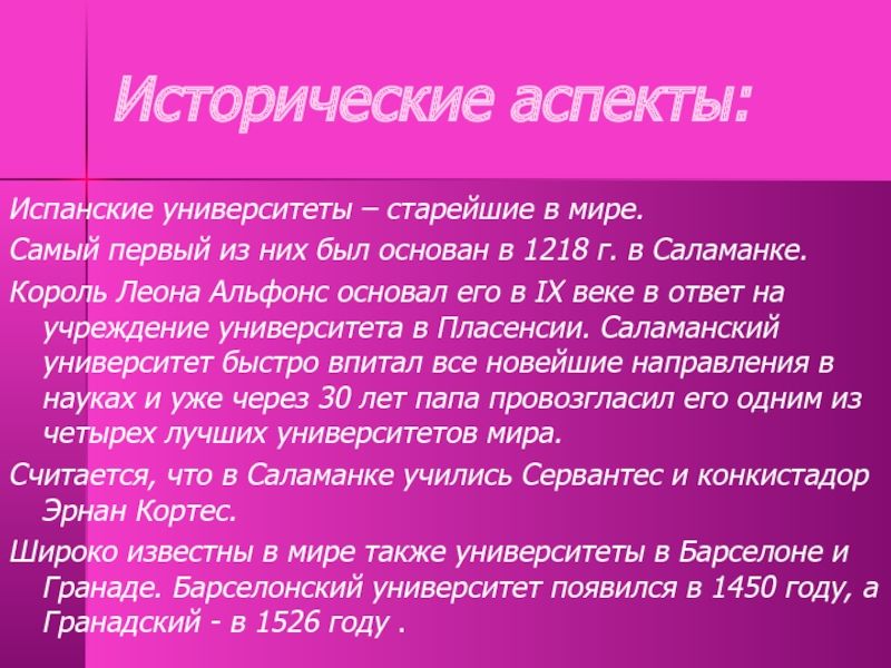 его в ІХ веке в ответ на учреждение университета в Пласенсии. Саламанский университет быстро впитал все новейшие направления в науках и уже через 30 лет папа провозгласил его одним из четырех лучших университетов мира.Считается, что в Саламанке учились Сервантес и конкистадор Эрнан Кортес.
