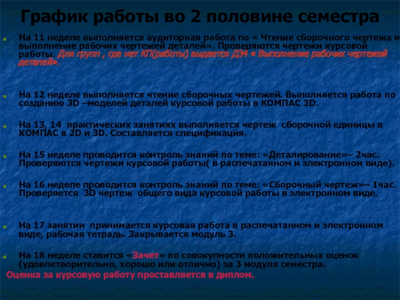 График работы во 2 половине семестраНа 11 неделе выполняется аудиторная работа по « Чтение сборочного чертежа и