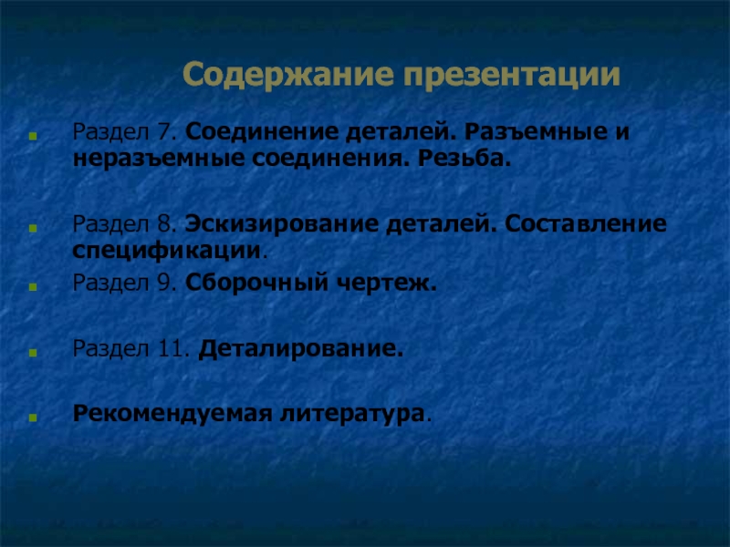 Содержание презентации Раздел 7. Соединение деталей. Разъемные и неразъемные соединения. Резьба.Раздел 8. Эскизирование деталей. Составление спецификации. Раздел 9. Сборочный чертеж. Раздел 11. Деталирование. Рекомендуемая литература. .
