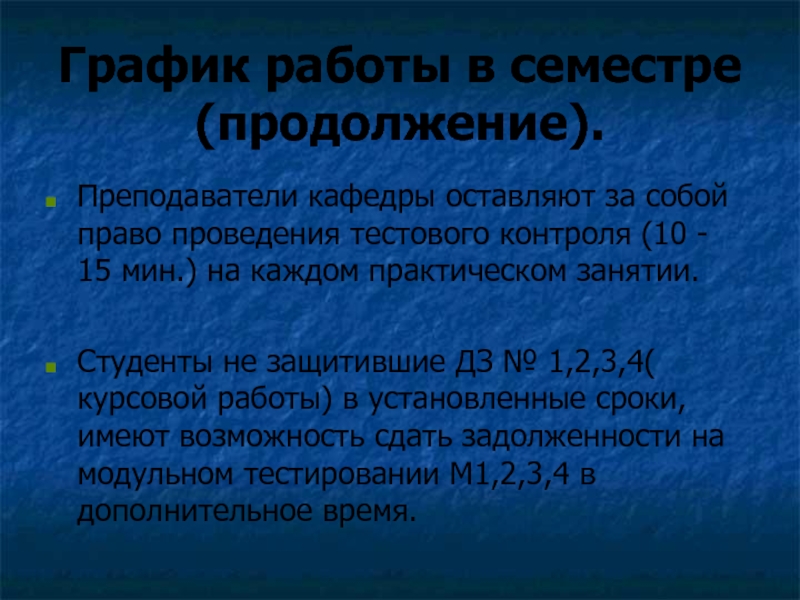 График работы в семестре (продолжение).Преподаватели кафедры оставляют за собой право проведения тестового контроля (10 - 15 мин.)