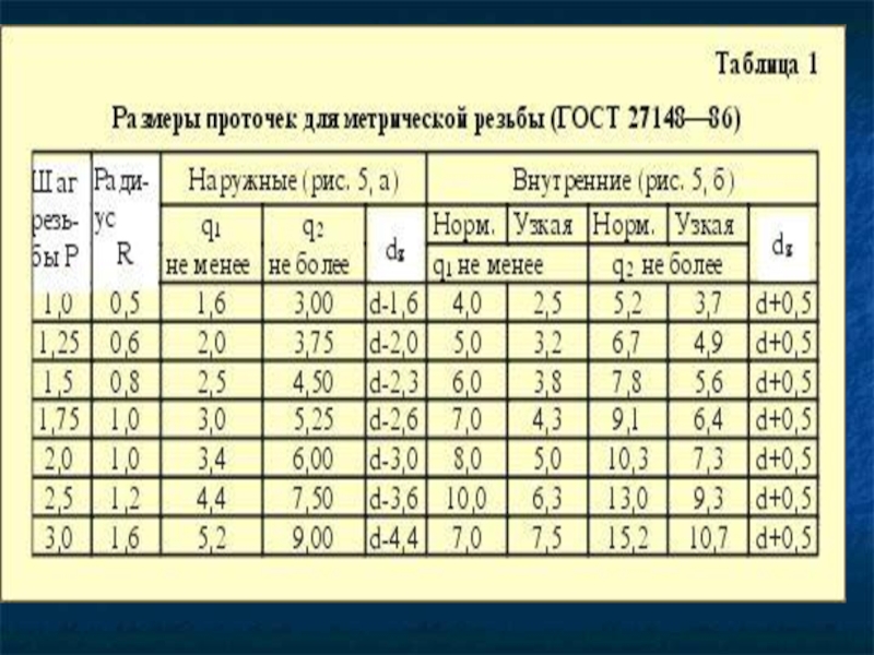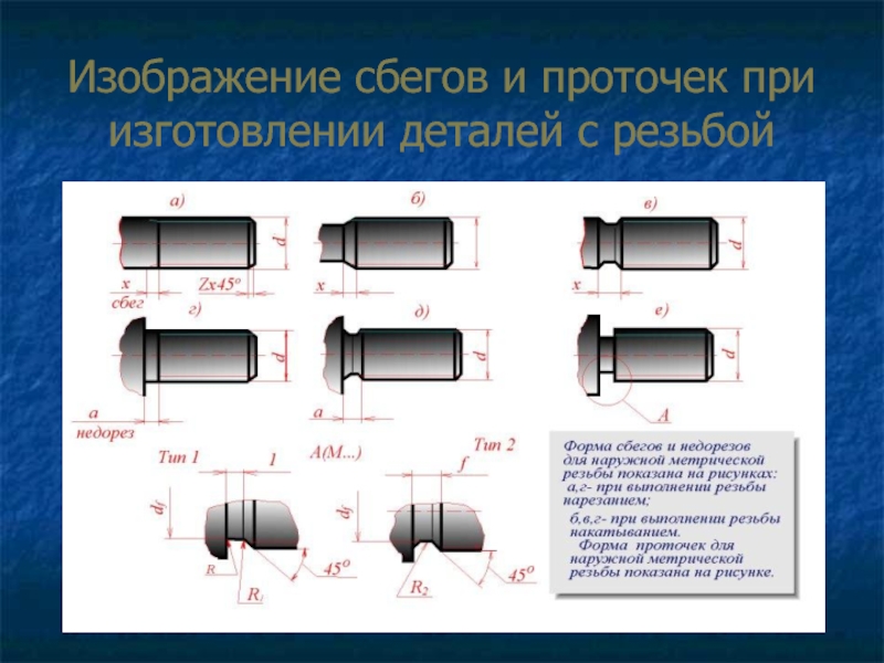 Слайд 21Изображение сбегов и проточек при изготовлении деталей с резьбой