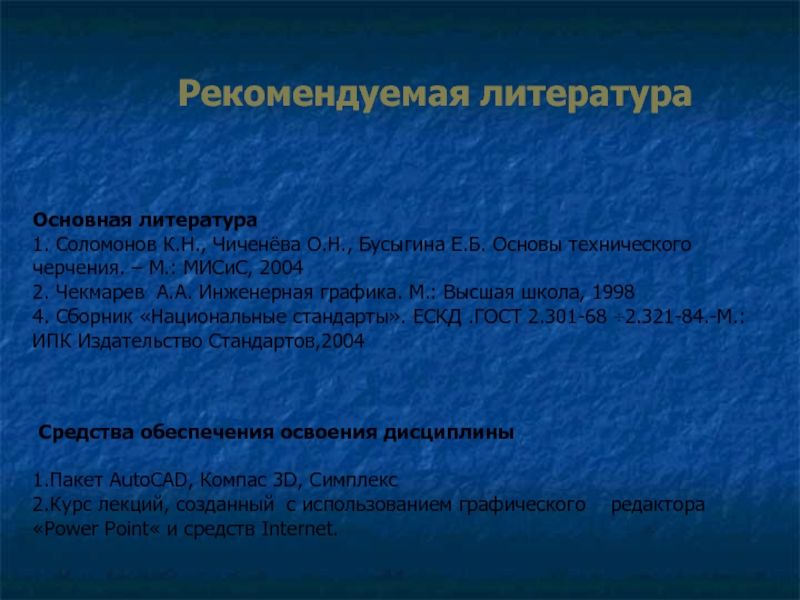 Рекомендуемая литература Средства обеспечения освоения дисциплины 1.Пакет AutoCAD, Компас 3D, Симплекс2.Курс лекций, созданный с использованием графического