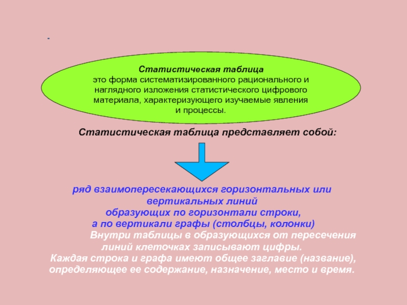 это форма систематизированного рационального и наглядного изложения статистического цифрового материала, характеризующего изучаемые явления и процессы.