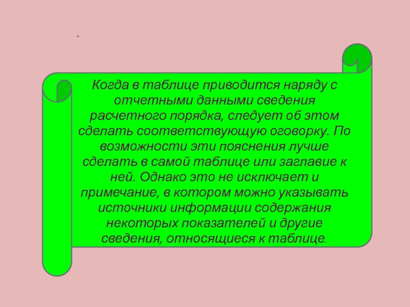 Когда в таблице приводится наряду с отчетными данными сведения расчетного порядка, следует об этом сделать соответствующую оговорку. По возможности эти пояснения лучше сделать в самой таблице или заглавие к ней. Однако это не исключает и примечание, в котором можно указывать источники информации содержания некоторых показателей и другие сведения, относящиеся к таблице.