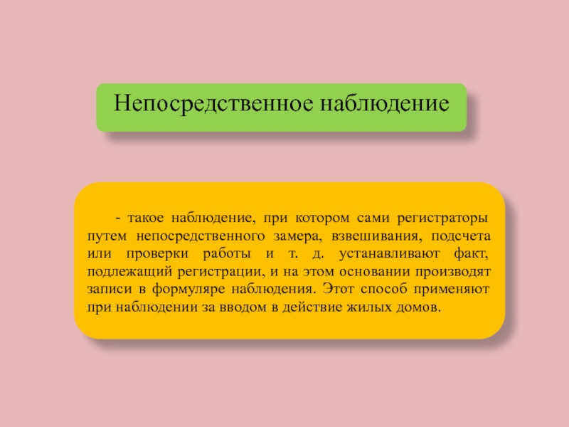 Непосредственное наблюдение	- такое наблюдение, при котором сами регистраторы путем непосредственного замера, взвешивания, подсчета или проверки работы и
