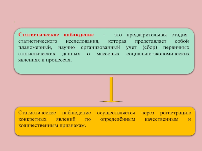 Статистическое наблюдение - это предварительная стадия статистического исследования, которая представляет собой планомерный, научно организованный учет (сбор) первичных статистических данных о массовых социально-экономических явлениях и процессах.Статистическое наблюдение осуществляется через регистрацию конкретных явлений