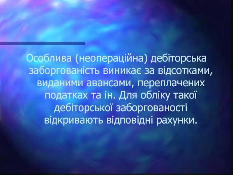 Особлива (неопераційна) дебіторська заборгованість виникає за відсотками, виданими авансами, переплачених податках та ін. Для обліку такої дебіторської