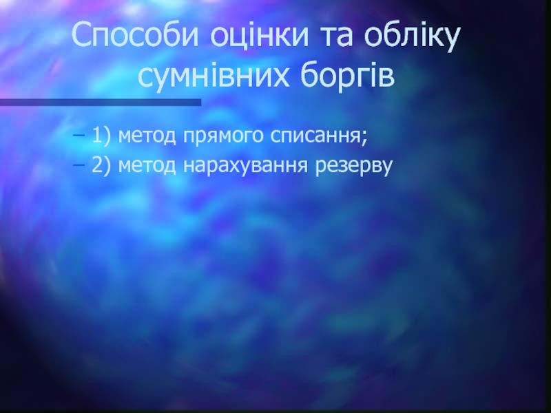 Способи оцінки та обліку сумнівних боргів1) метод прямого списання; 2) метод нарахування резерву