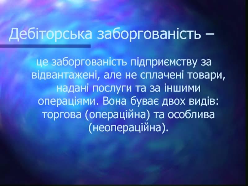 Дебіторська заборгованість – це заборгованість підприємству за відвантажені, але не сплачені товари, надані послуги та за іншими