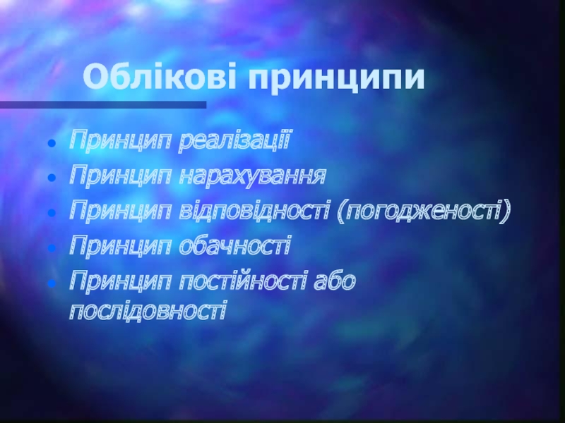 Облікові принципиПринцип реалізації Принцип нарахуванняПринцип відповідності (погодженості)Принцип обачності Принцип постійності або послідовності