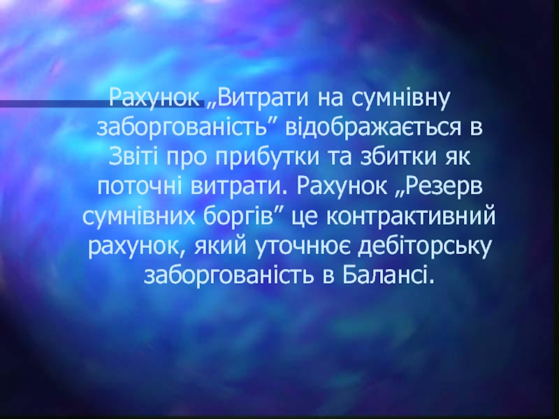 Рахунок „Витрати на сумнівну заборгованість” відображається в Звіті про прибутки та збитки як поточні витрати. Рахунок „Резерв