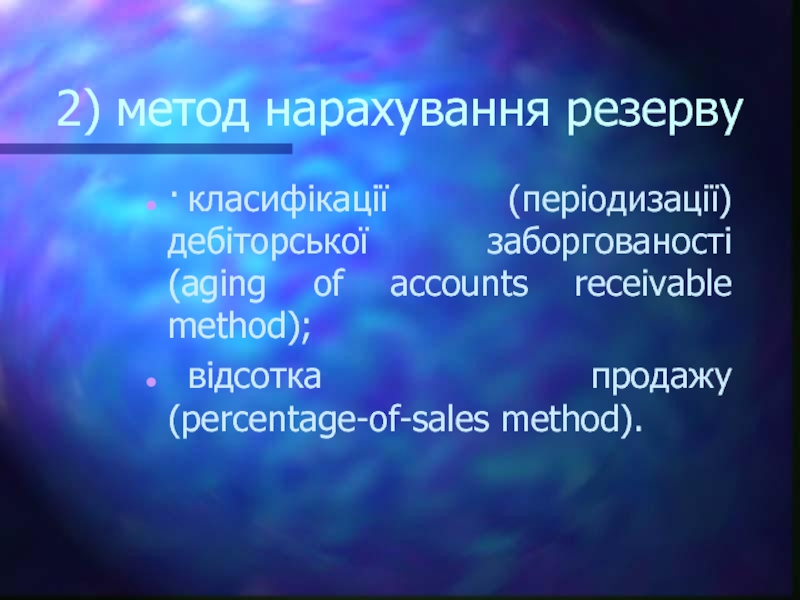 2) метод нарахування резерву·	класифікації (періодизації) дебіторської заборгованості (aging of accounts receivable method);	відсотка продажу (percentage-of-sales method).