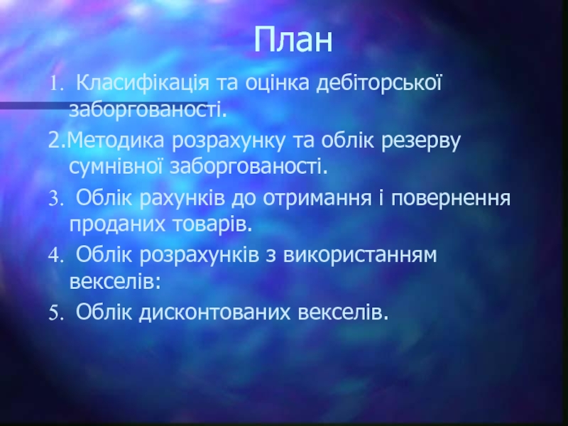 План1. Класифікація та оцінка дебіторської заборгованості. 2.Методика розрахунку та облік резерву сумнівної заборгованості.3. Облік рахунків до отримання i повернення проданих товарів.4. Облік розрахунків з використанням векселів:5. Облік дисконтованих векселів.