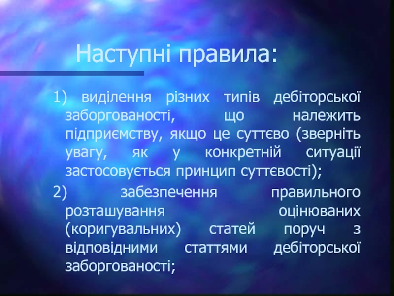 Наступні правила:1) виділення різних типів дебіторської заборгованості, що належить підприємству, якщо це суттєво (зверніть увагу, як у