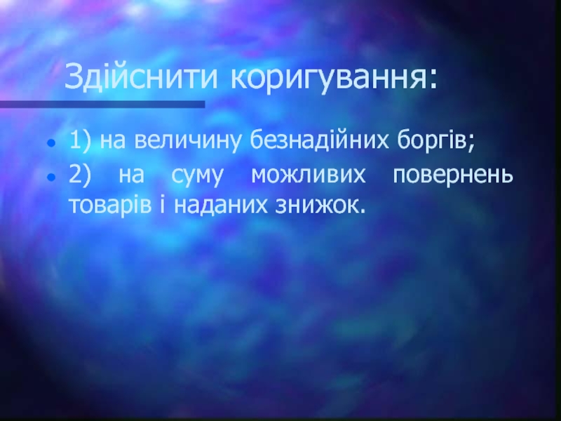 Здійснити коригування:1) на величину безнадійних боргів;2) на суму можливих повернень товарів і наданих знижок.