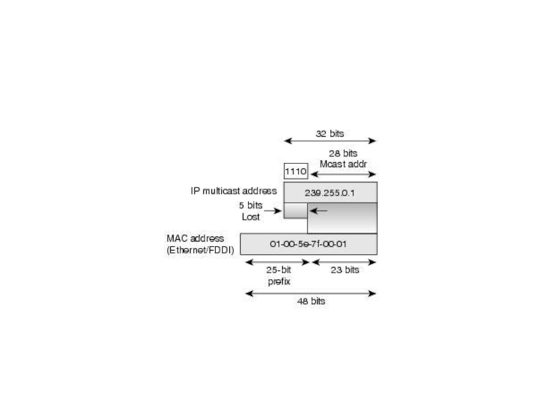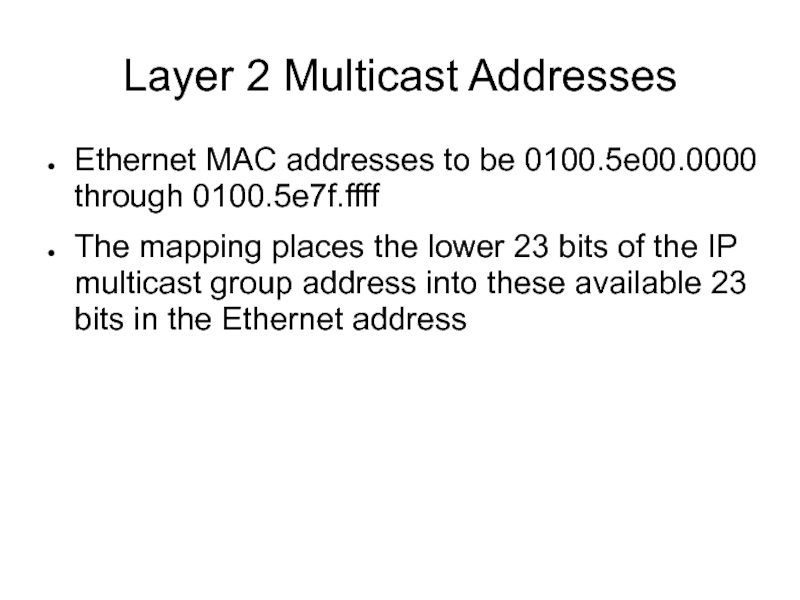 Layer 2 Multicast AddressesEthernet MAC addresses to be 0100.5e00.0000 through 0100.5e7f.ffffThe mapping places the lower 23 bits